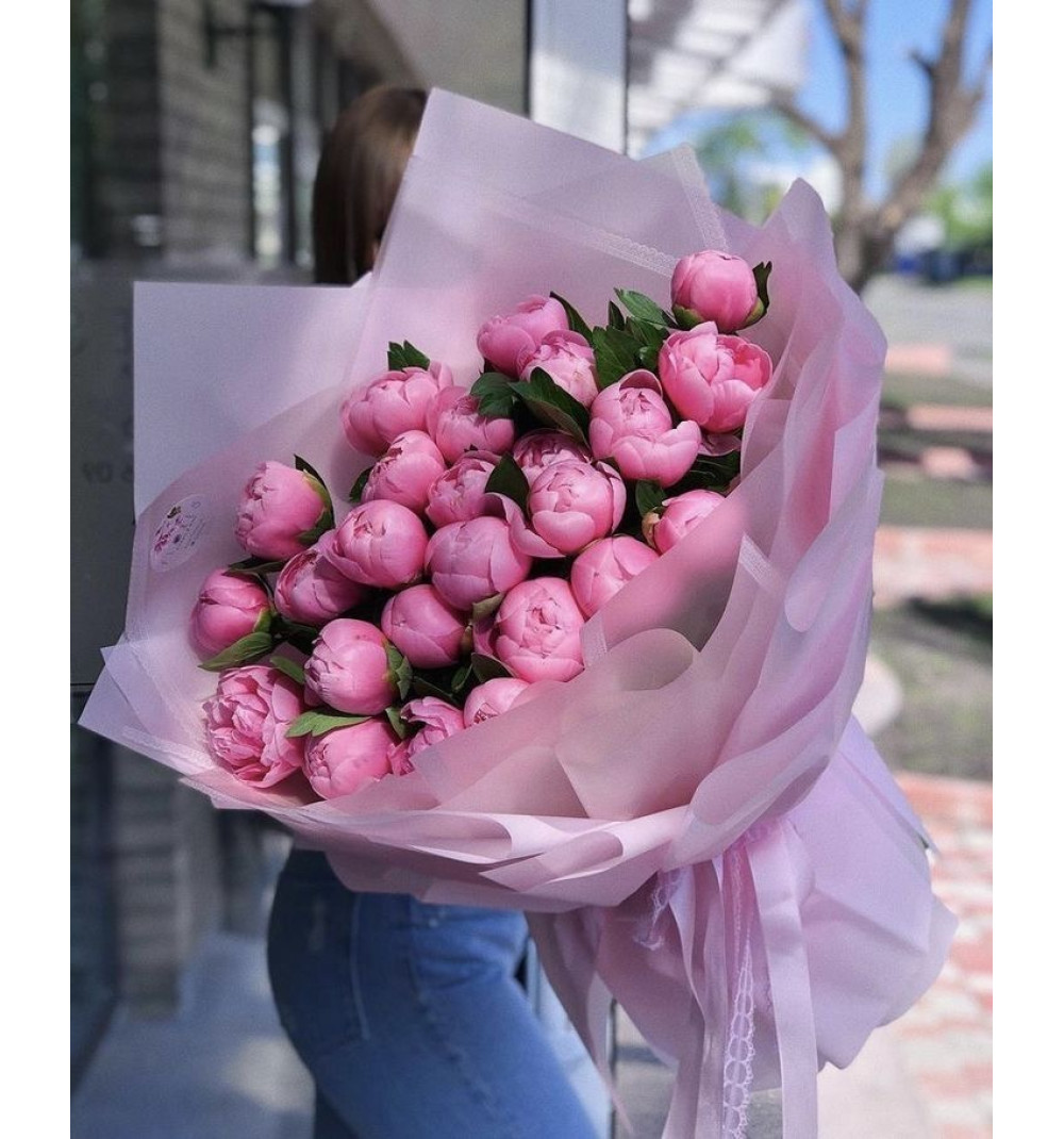 Букет из 25 пионов — это по-настоящему роскошная и впечатляющая композиция. Пышные, ароматные бутоны создают объёмное цветочное облако, полное нежности и изящества.